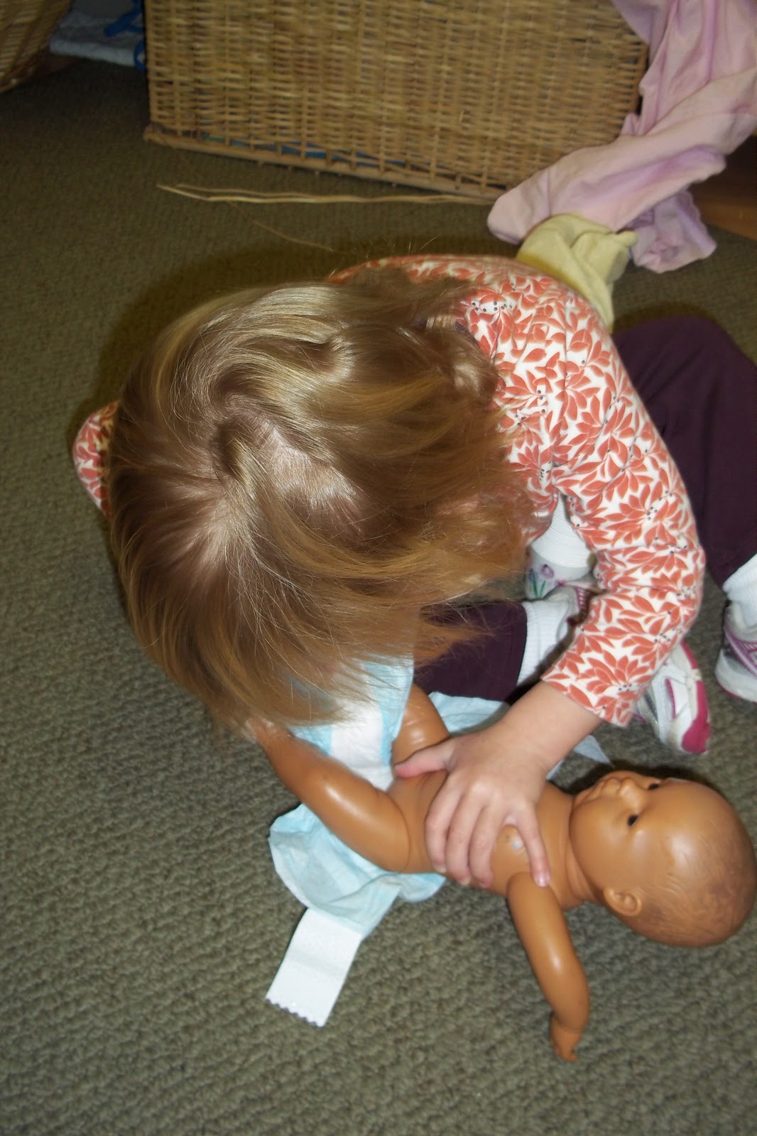 i'm glad someone in the family enjoys changing diapers. this would be great if she could master this skill in time for the arrival of her little sister or brother.